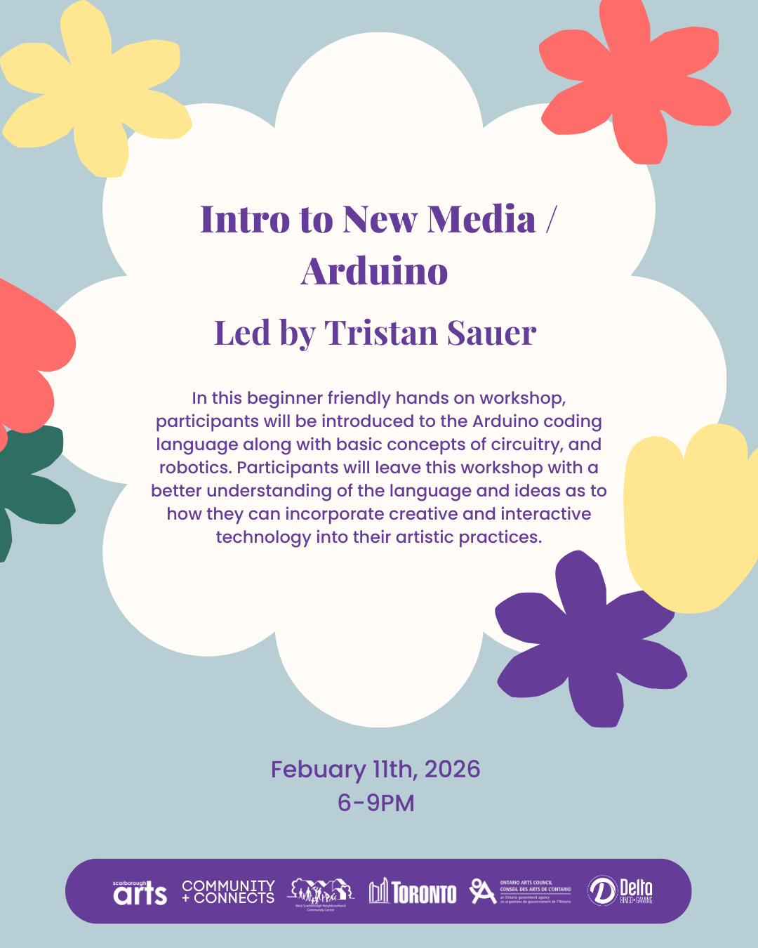 In this beginner friendly hands on workshop led by Tristan Sauer, participants will be introduced to the Arduino coding language along with basic concepts of circuitry, and robotics. Participants will leave this workshop with a better understanding of the language and ideas as to how they can incorporate creative and interactive technology into their artistic practices.