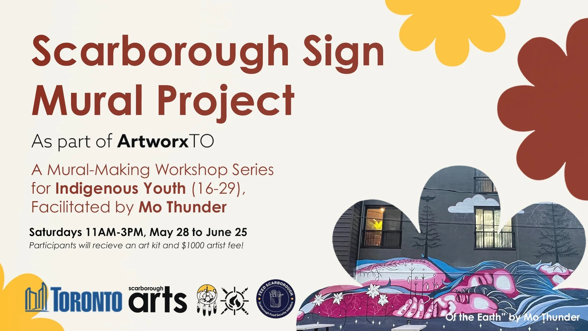 This workshop series is for Indigenous youth ages 16-29 and requires a commitment of attending 5 workshop sessions held weekly on Saturdays from May 28th-June 25th. The program will provide each participant with: a free art kit, instruction and mentorship by Mo Thunder to develop their artistic skills, professional development, a $1000 artist and participation fee, and the opportunity for their work to be featured on the Scarborough Sign which will be installed on June 30th at the very high traffic Scarborough Town Centre!